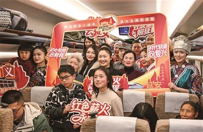 1月26日,旅客与乘务员在遵义开往延安方向的G3360次列车上合影。