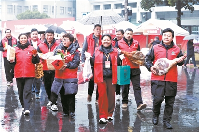 1月30日,淳安县的基层干部和新农人在农品市集现场拿着各自的农特产品向杭州市民推介。