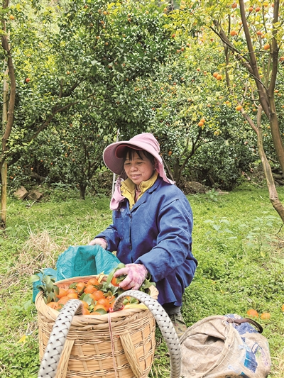 想到第二天就要去百色城区照顾孙子,岑氏拾不由得加快了剪果的速度。砂糖橘高悬枝杈,岑氏拾站上人字梯,一手抓果,一手挥动着专用剪刀,只听到咔嚓咔嚓声响,砂糖橘便被装进腰间的布袋。这一天,岑氏拾和老伴梁家都一共剪了3000斤砂糖橘。