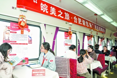2月5日,旅客与招聘企业代表在K8362次列车上洽谈。 当日,由中国铁路上海局集团有限公司合肥客运段联合合肥市人力资源和社会保障局举办的列车招聘会在上海站开往阜阳站的K8362次列车上举行,为返乡游子架起就业对接的桥梁。 新华社记者 杜宇/摄