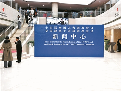 媒体记者和工作人员在全国两会新闻中心忙碌。全国两会启幕在即,二月二十七日,设在北京梅地亚中心的全国两会新闻中心正式启用,为中外记者提供新闻服务。中国妇女报全媒体记者 杨睿/摄