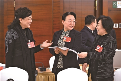 三月十日,十四届全国人大四次会议河北代表团小组会议结束后,王淑英代表(左一)、杨伟坤代表(左二)、杨瑞硕代表(左三),就破解未成年人保护治理中的难点堵点问题展开讨论。中国妇女报全媒体记者 杨睿/摄