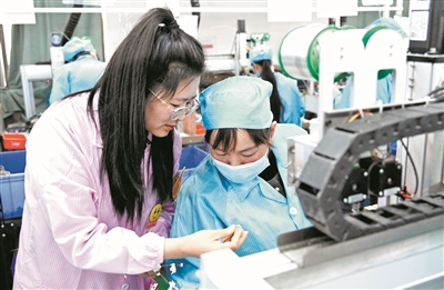 3月25日,陈守利(左)在指导工人提高加工质量。陈守利原来是会泽县金钟镇麦地村人,在移居新社区后找到了工作,当上了指导安全员。