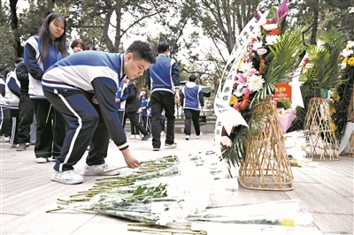 4月2日,北京市八宝山革命公墓举办第六届清明公众开放日暨2026年清明节红色诗词朗诵活动。图为学生们以绿色祭扫方式表达追思。中国妇女报全媒体见习记者 史羽航/摄