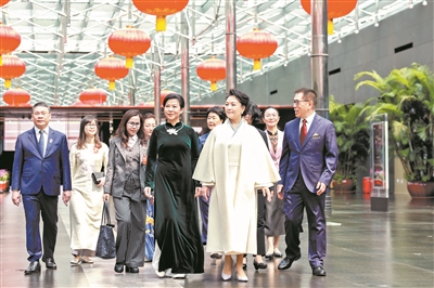 彭丽媛和吴芳璃一同参观歌剧院、虚拟现实创作空间和录音工作室,了解大剧院在支持艺术创作、提供文化服务和开展国际文化交流等方面所做的工作。其间,还观看中国民族舞剧排练和合唱团录音,不时驻足交流。